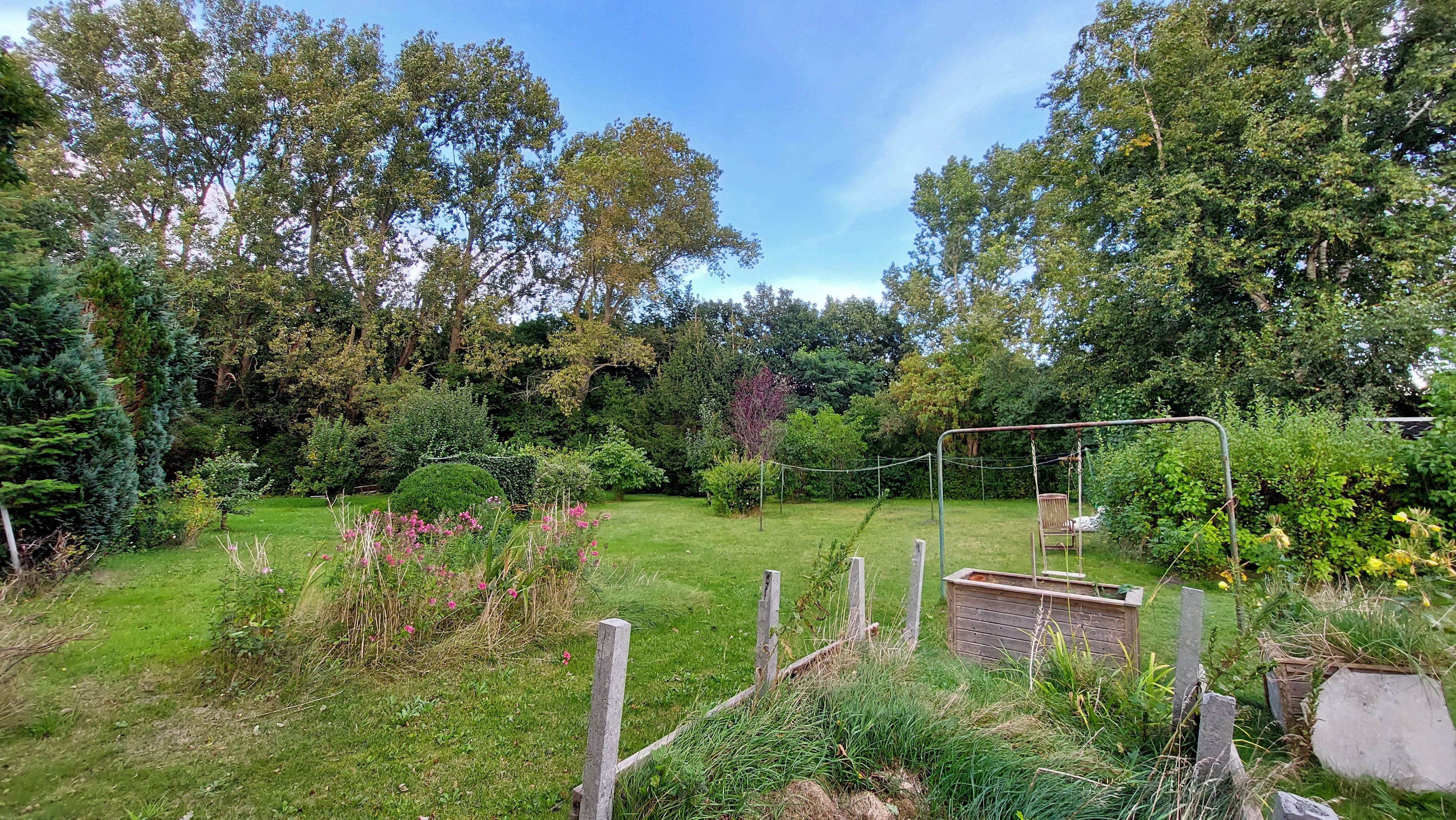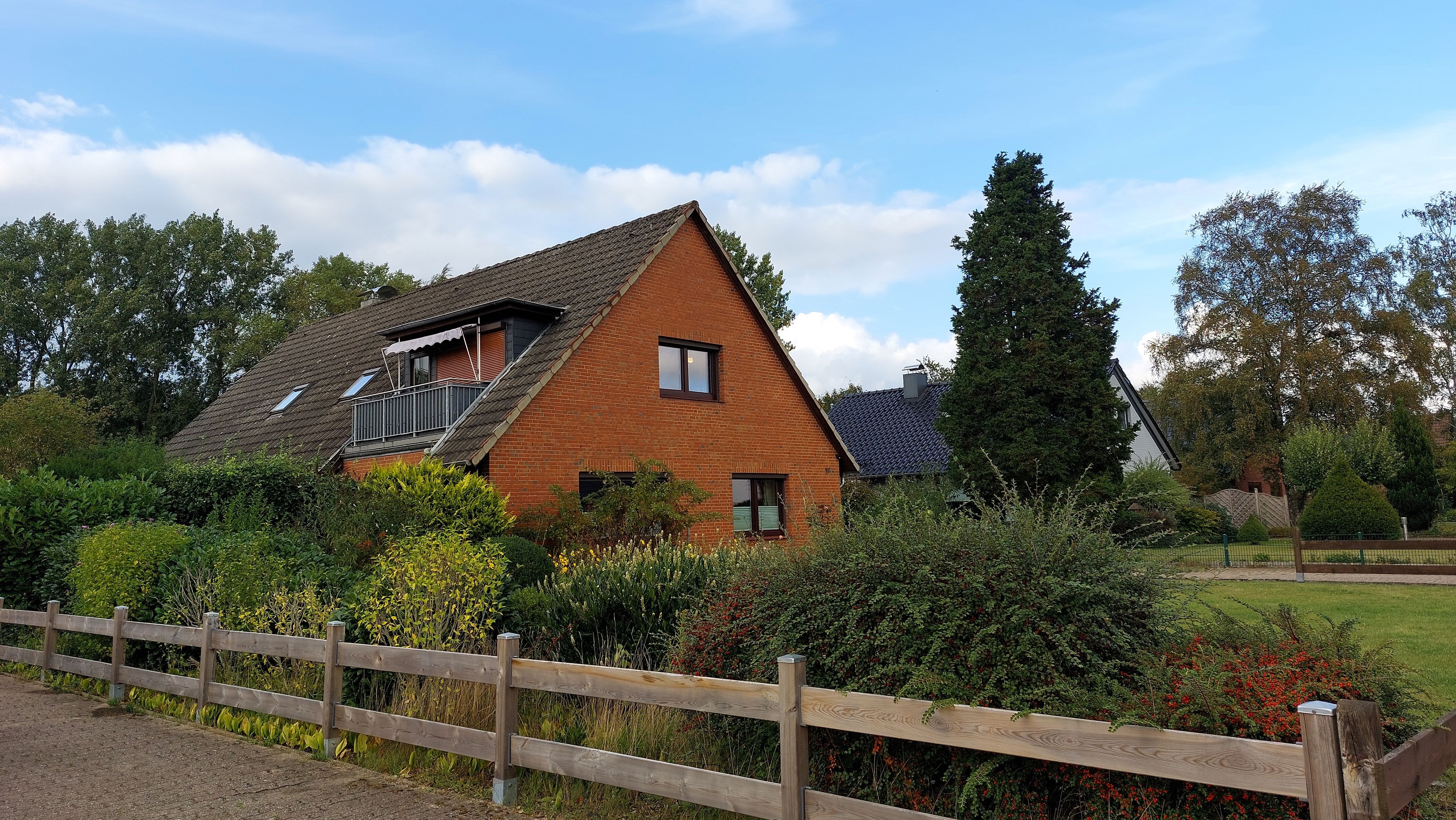 Das in einer 30-ziger Zone gelegene Objekt hat 2 Terrassen, 2 Garagen, einem Raum für Gartenmöbel und Fahrräder sowie eine gepflasterte PKW-Auffahrt. Das ruhig gelegene große Grundstück ist von der Straße aus nicht einsehbar und verfügt über eine pflegeleichte Rasenfläche mit kleinen Blumenbeeten und heimischen Gehölzen, und ist daher für eine Familie mit Kindern bestens geeignet. Das Grundstück bietet sich auch für den Gemüsebau und Kleintierhaltung an. Auch eine Grundwasserpumpe ist im hinteren Bereich des Grundstückes vorhanden. In unmittelbarer Nähe befindet sich ein Spielplatz.