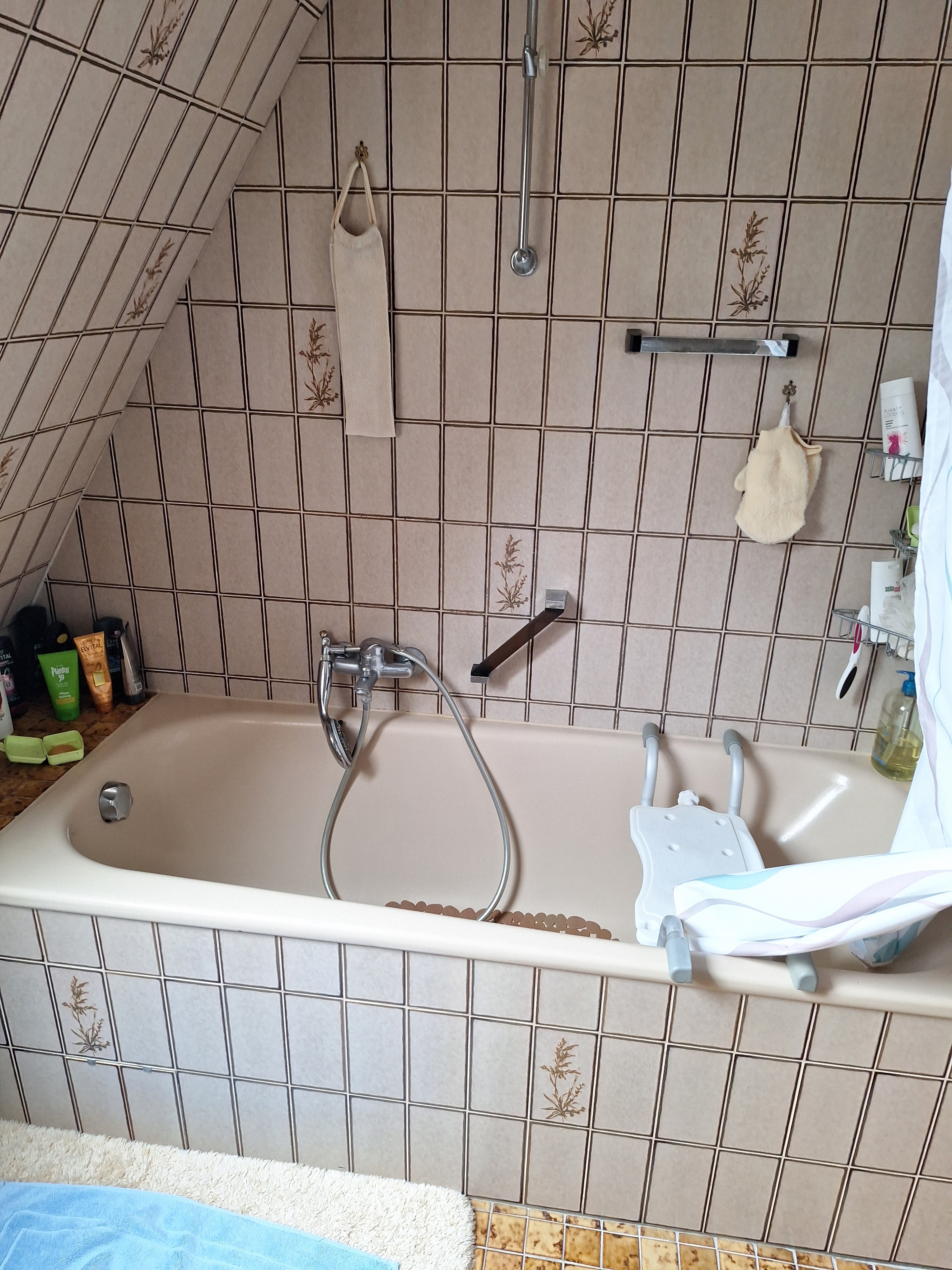Das Wannenbad mit Wandhohen Fliesen ist sehr geräumig.