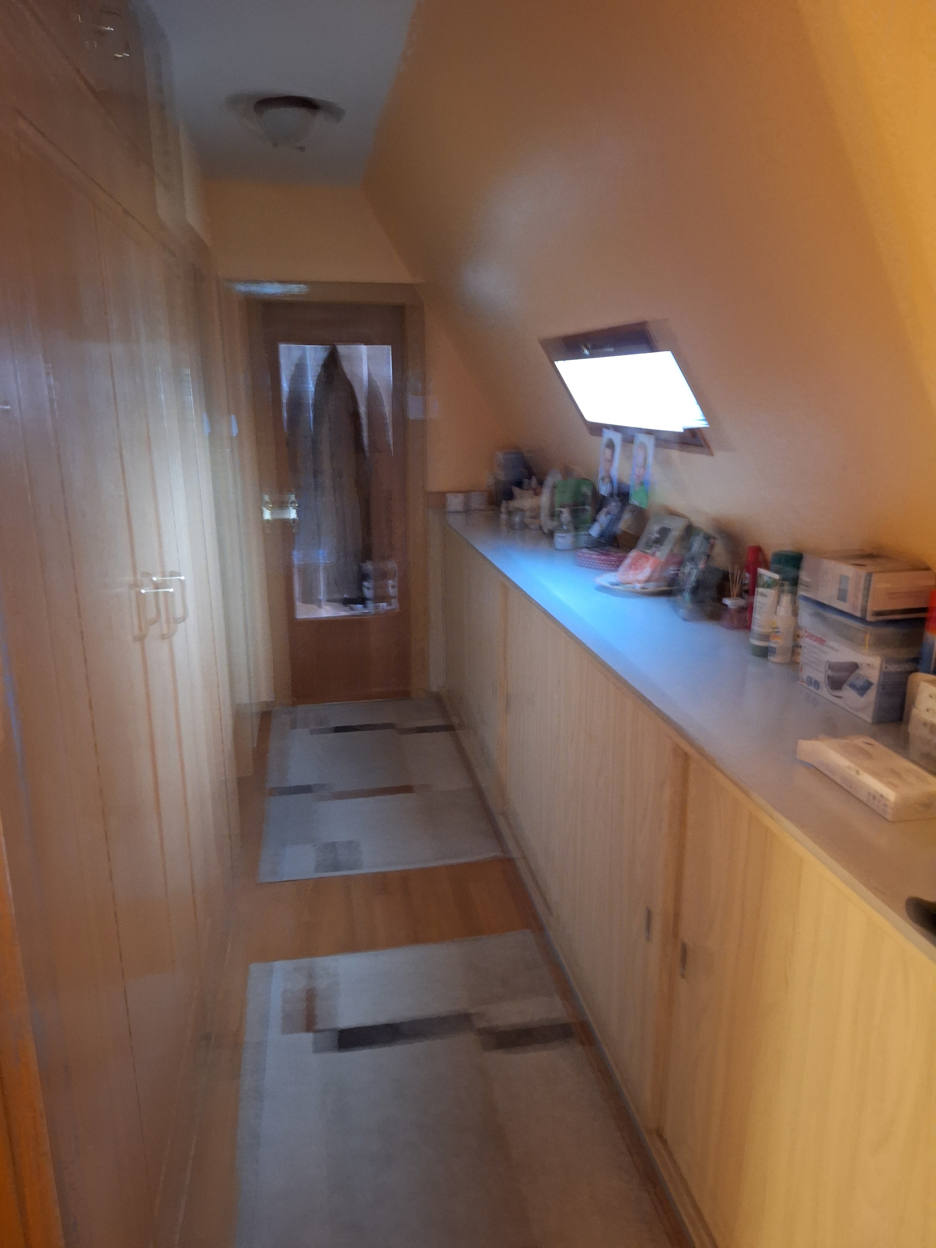 Gehen Sie über die Treppe zum Obergeschoss und ersehen Sie im langgezogenen Flur einige Einbauschränke.